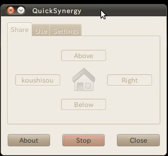 設定するために synergy.conf を弄った。だが、起動方法がいまいち判らない。面倒になったので、QuickSynergy をインストールしてみた。