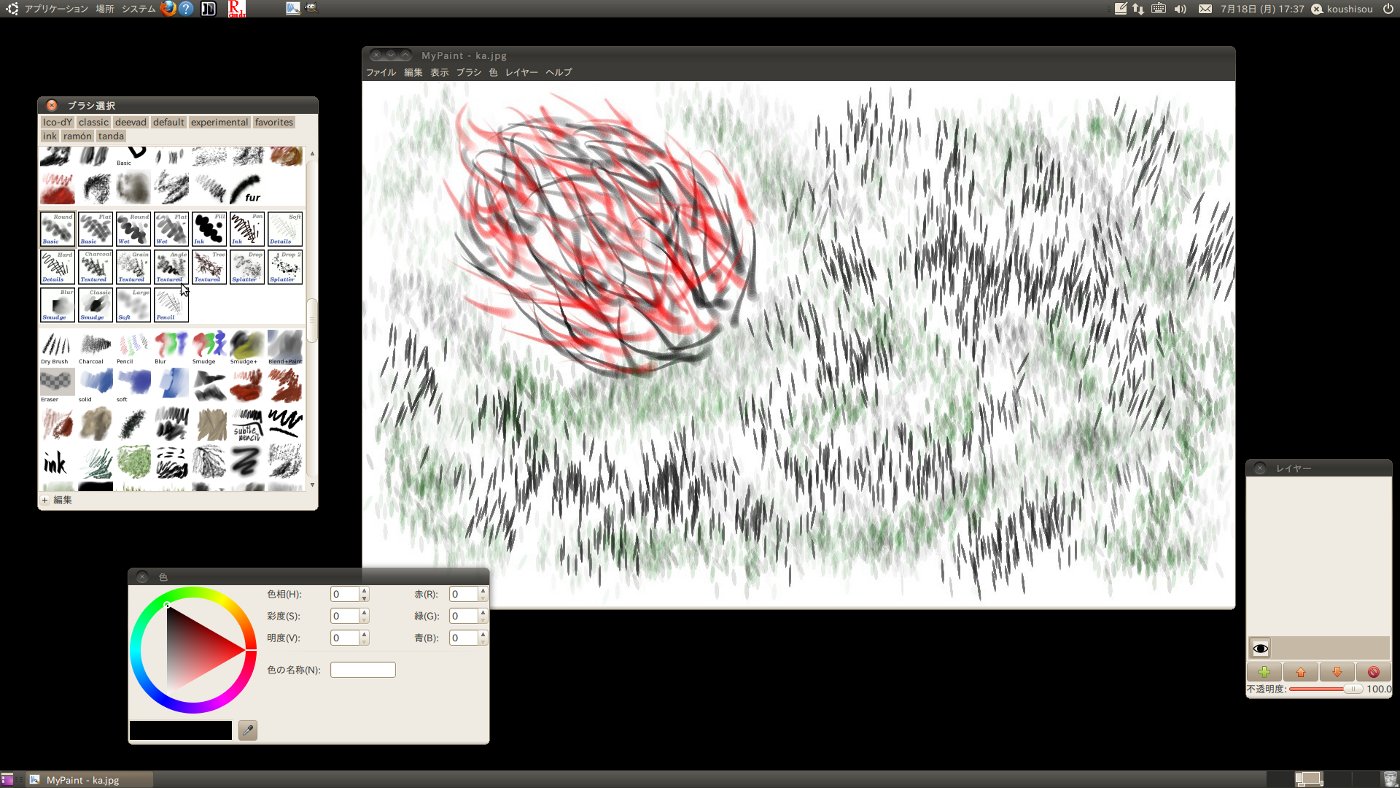 それはさておき、とりあえず今回は Mypaint を使ってお絵描きしてみた。